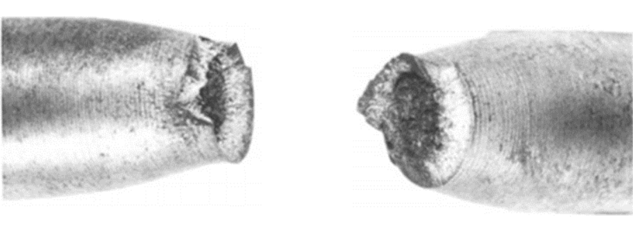 Another Image below shows that after necking, the separation of the two halves look like a Cup and Cone at the ends. This is a proof of a gradual failure, proof that it is a Ductile material.