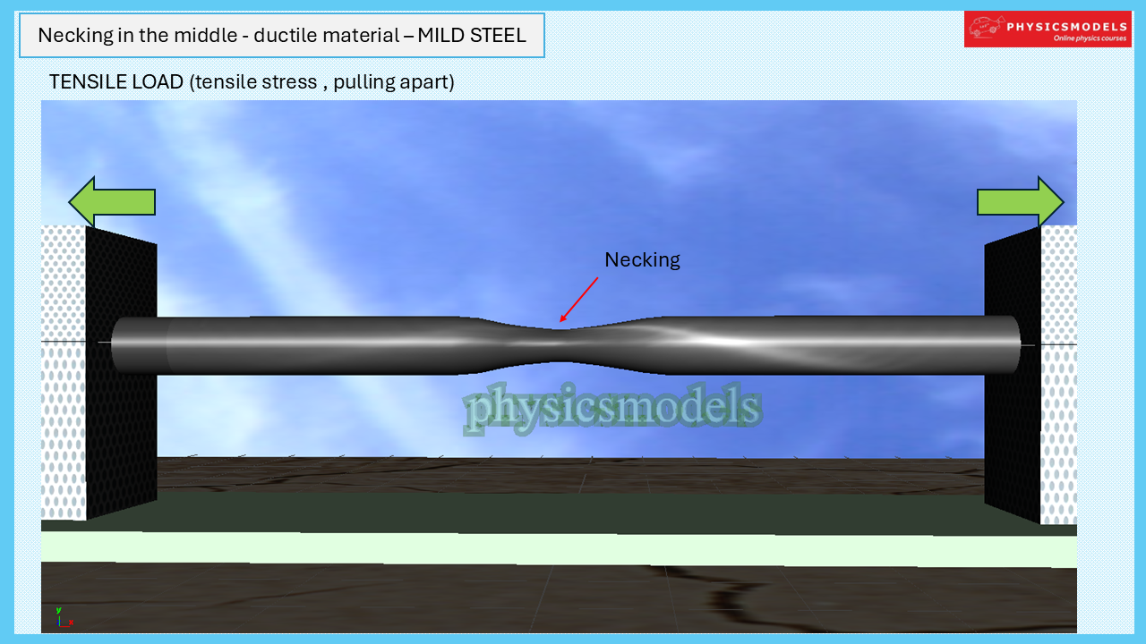 NECKING becomes the weakest link. The rod elongates more, neck becomes even smaller, and finally the neck becomes so small that the two halves separate out . This failure stage is called DUCTILE FAILURE, see physicsmodels image below